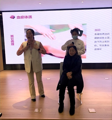 表彰結(jié)束后,由西安中醫(yī)腦病醫(yī)院治未病科主任余亞蘭主任醫(yī)師為大家?guī)?lái)題為《中醫(yī)藥里的女性養(yǎng)生》的女性養(yǎng)生保健科普講座。大家根據(jù)現(xiàn)場(chǎng)發(fā)放的《中醫(yī)體質(zhì)辨識(shí)分類(lèi)評(píng)定表》進(jìn)行體質(zhì)類(lèi)別自初測(cè),根據(jù)自測(cè)結(jié)果帶著疑問(wèn)聆聽(tīng)講座。余主任從九種體質(zhì)特點(diǎn)及養(yǎng)生、乳腺病的自我檢查方法、面部美容穴位按摩、艾灸的正確使用、頸椎操、養(yǎng)生藥茶推薦等6個(gè)專(zhuān)題為大家進(jìn)行了專(zhuān)業(yè)講授和現(xiàn)場(chǎng)指導(dǎo)。女職工們爭(zhēng)先恐后上臺(tái)進(jìn)行互動(dòng),會(huì)場(chǎng)氣氛非常活躍。